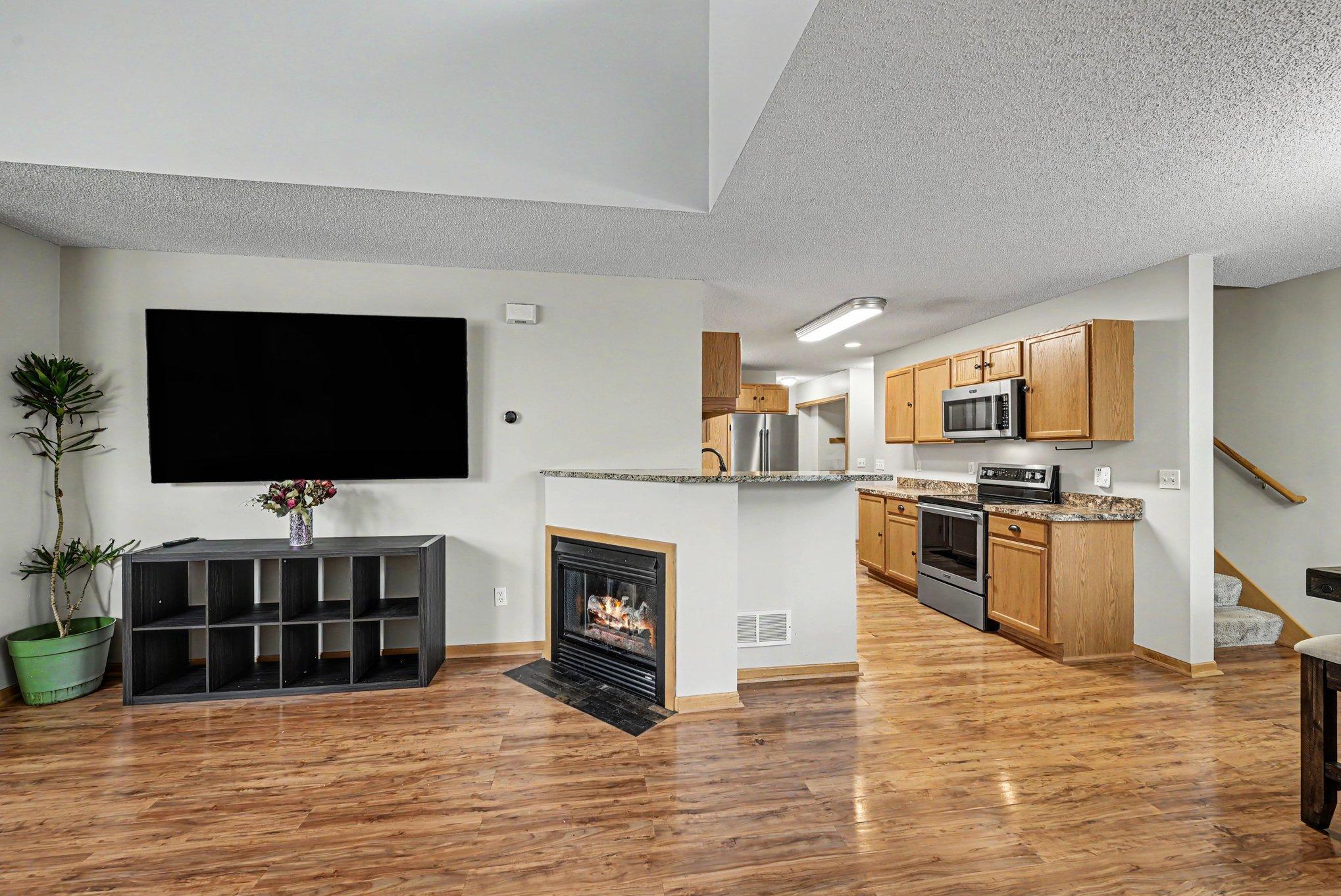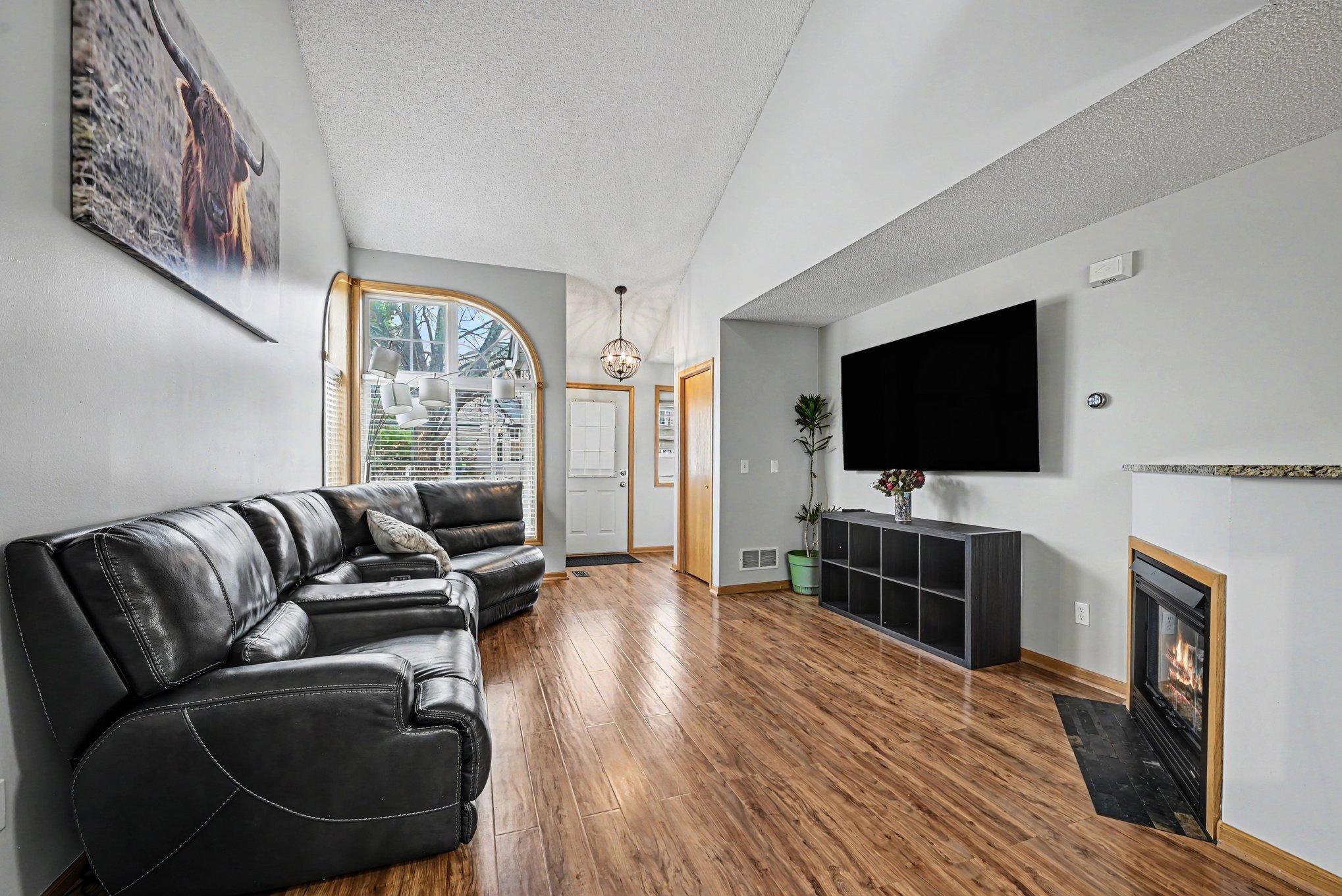 Open main level with vaulted ceilings, natural light, and electric fireplace.