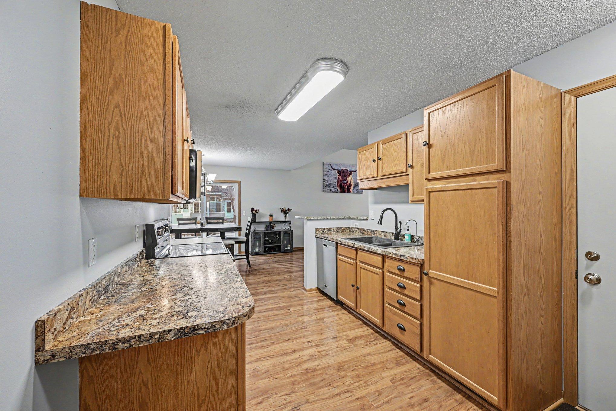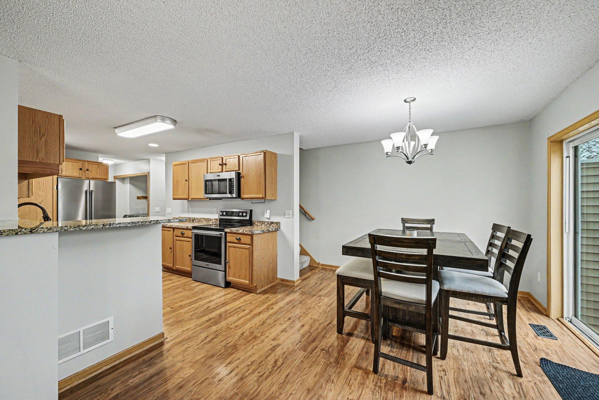 Kitchen features stainless steel appliances, ample cupboard space and flows to dining area.