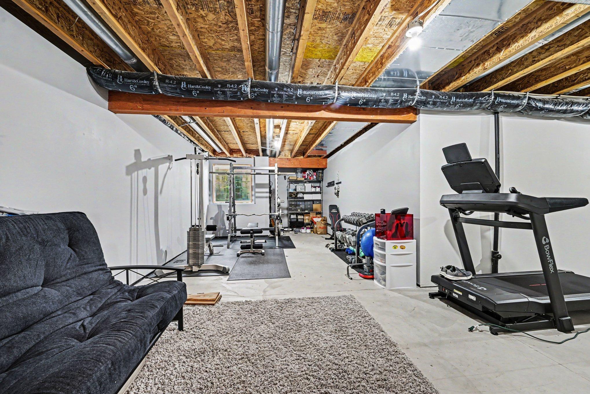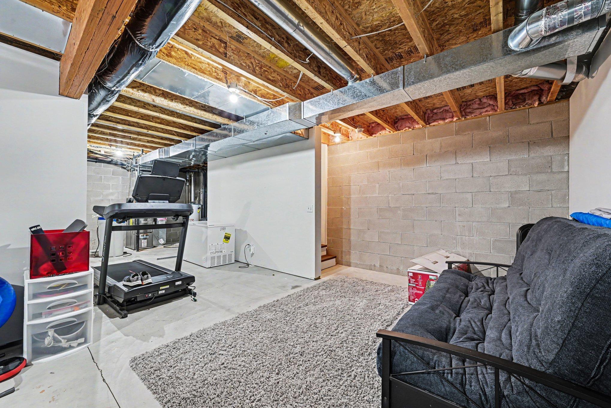 Unfinished lower level with egress window and bath rough-in for future expansion.