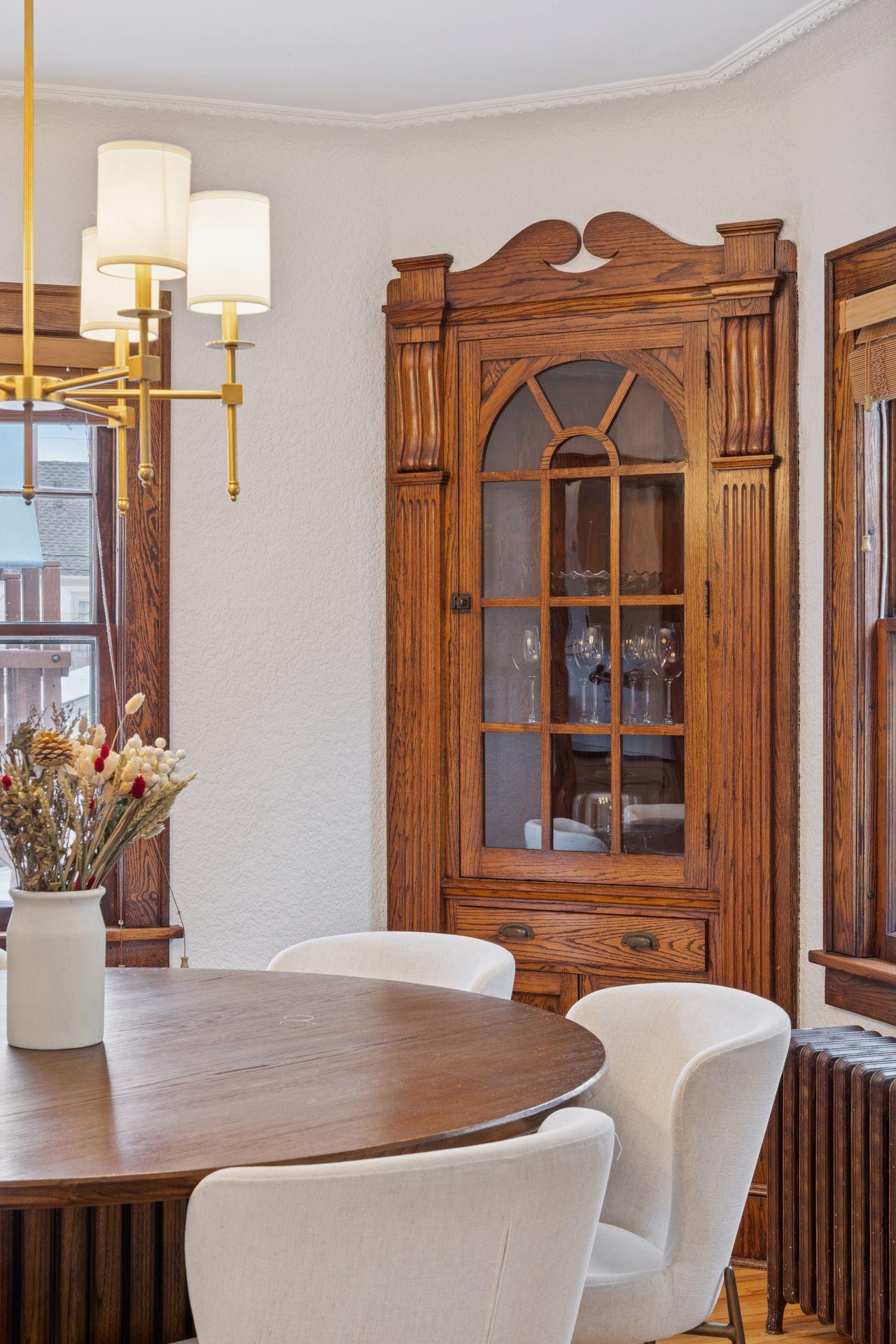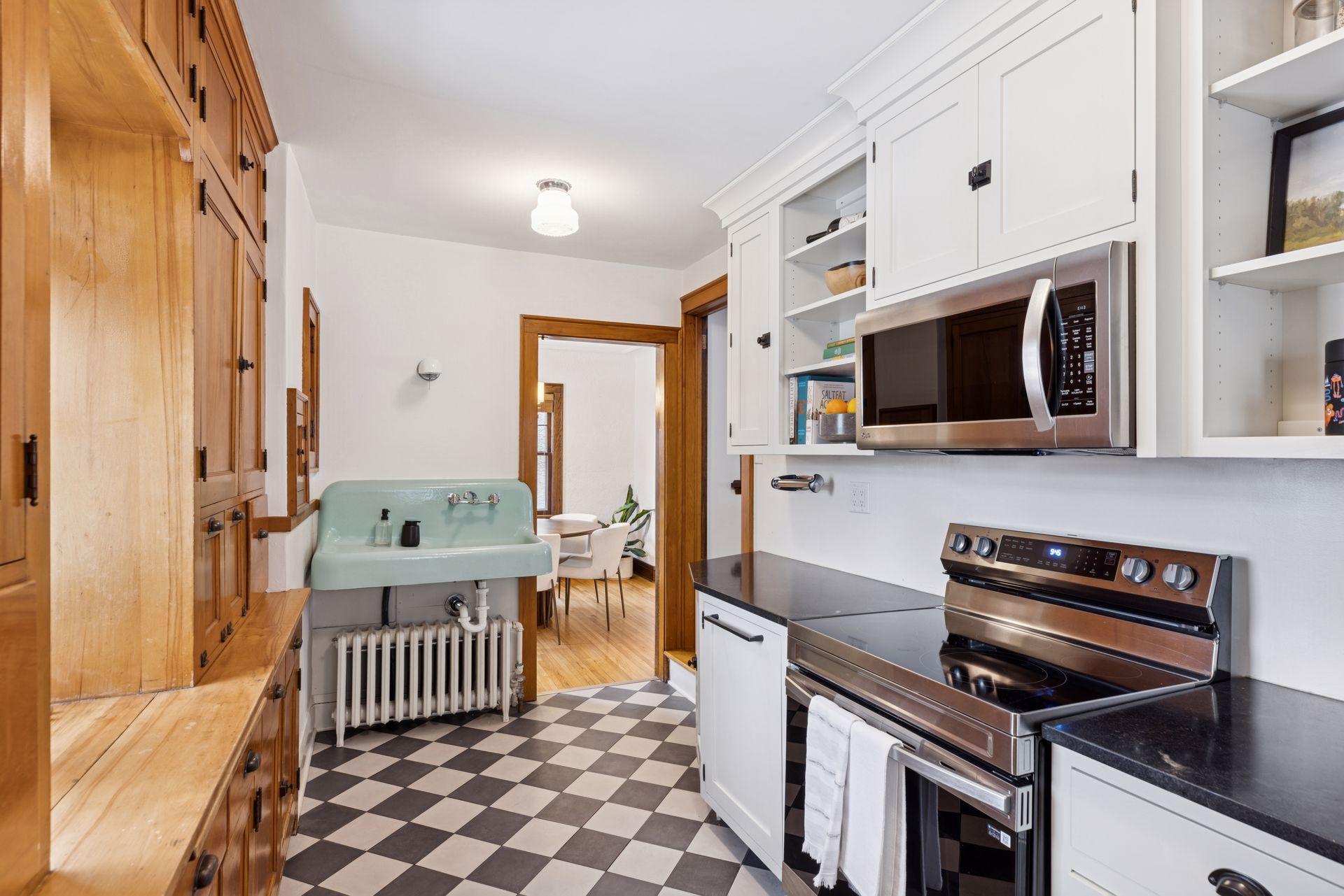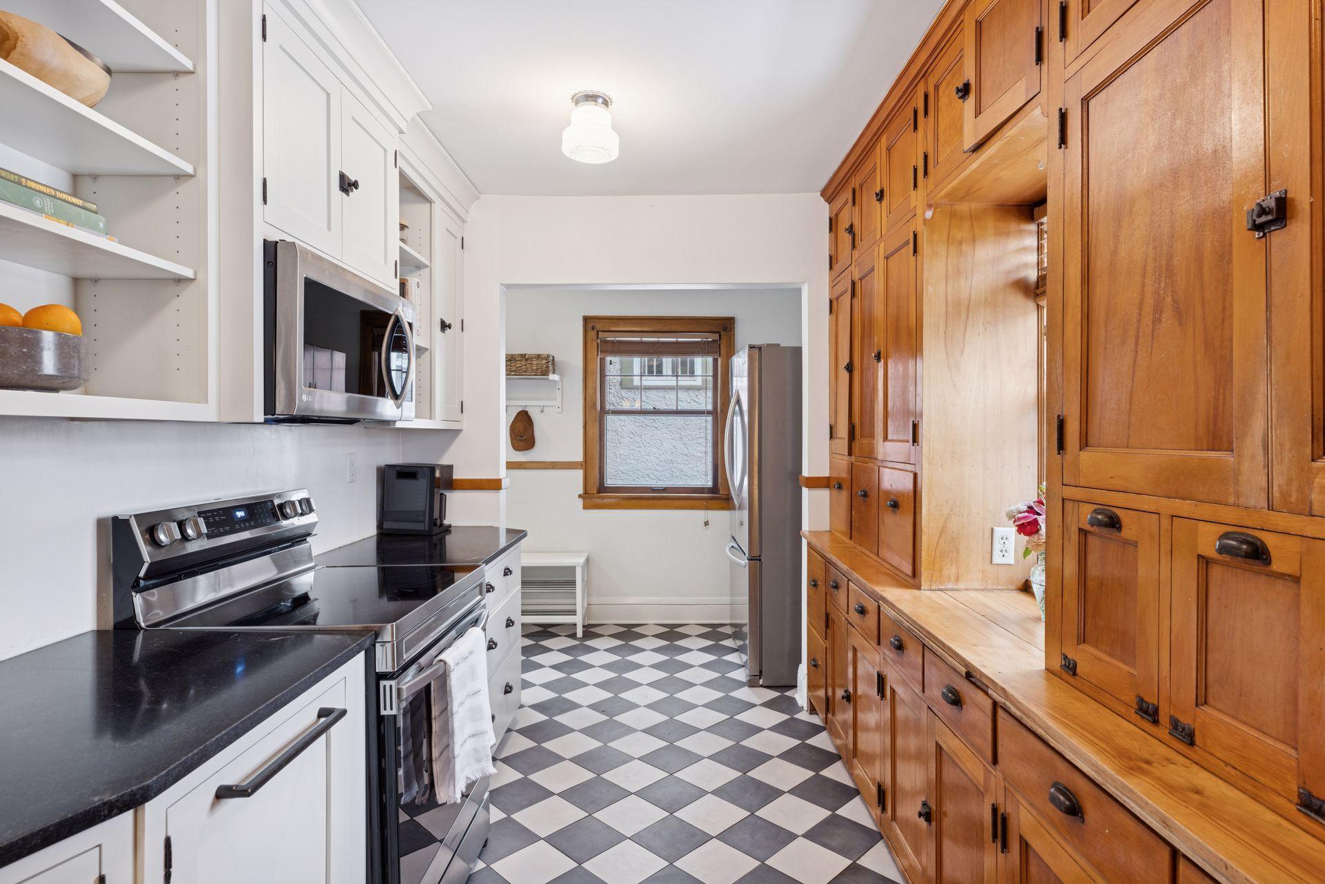 The main level features warm hardwood floors, detailed woodwork, a brick fireplace, and beautiful built-ins in the dining room. The kitchen provides abundant cabinet space, a new electric oven, and the added comfort of heated electric floors. Radiator heat with updated PEX plumbing and Honeywell two-zone controls offers efficient and consistent warmth throughout the home.