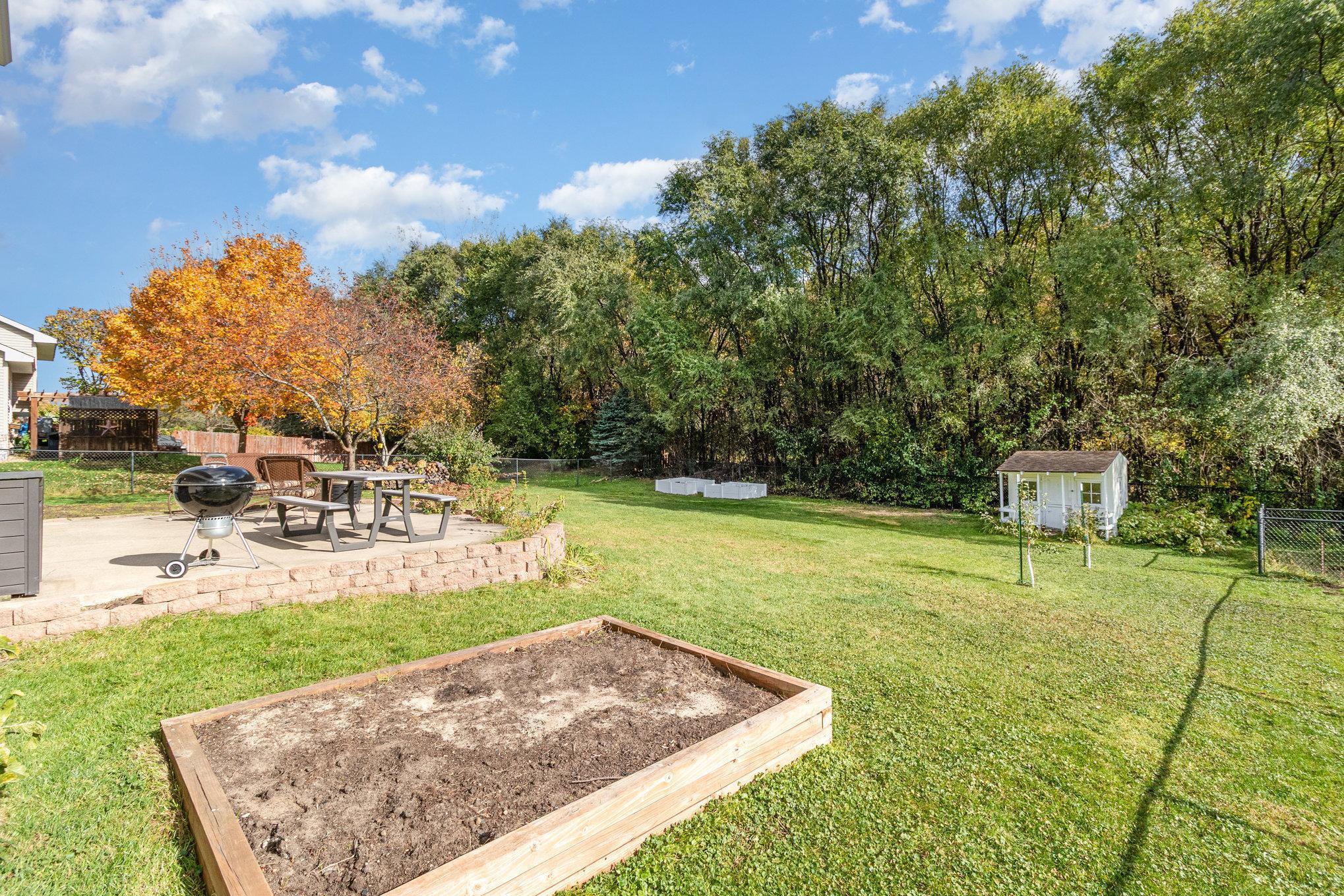 Outdoors, the backyard provides privacy and a peaceful setting framed by mature trees. A three-car garage adds convenience and storage without sacrificing aesthetics.