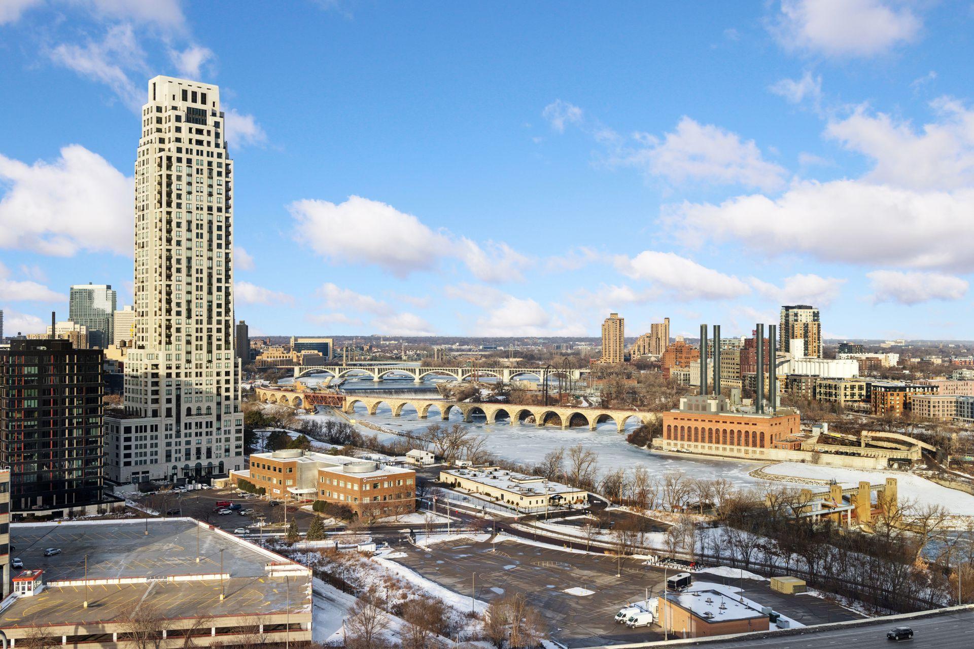 Sophisticated city living at Riverview Towers! This 19th floor location with amazing views facing the Mississippi River, falls and city skyline awash with bright natural light. This unit originally a 2-bedroom floorplan was renovated to become larger living and dining areas. The Kitchen has great cabinetry along with a countertop eat-in space. Adjacent is the entry door to an outdoor porch with down-river and U of M campus views. A full hall bath leads to the primary suite. The ensuite bath is a 3/4 bath with walk-in shower. Riverview Towers is an established condo where Community living is comprehensive; monthly HOA includes all utilities, basic cable, internet, heated indoor pool, whirlpool, fitness room, sauna, outdoor patio with gas grills, community rm w kitchen, package room, prof. mgmt. New HOA policy now permitting rentals (with restrictions), and pets (with restrictions.) Tucked away near the U of M law school, easy access to downtown, the University and highways to anywhere.