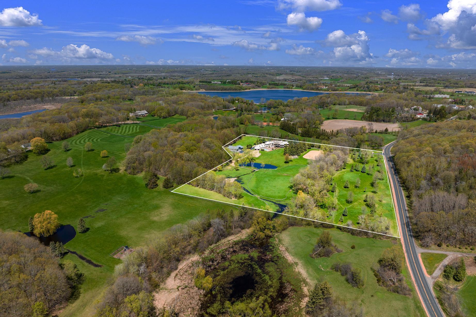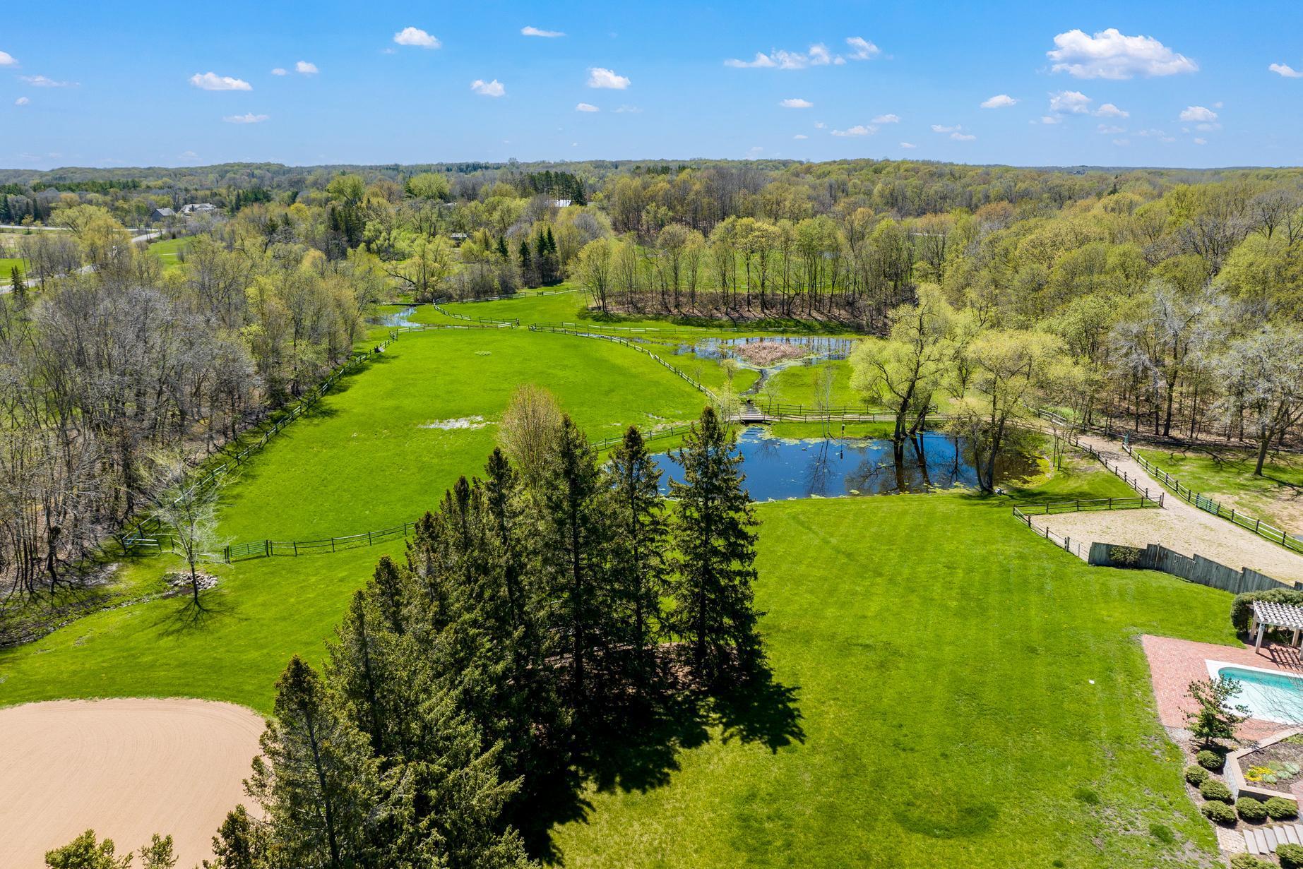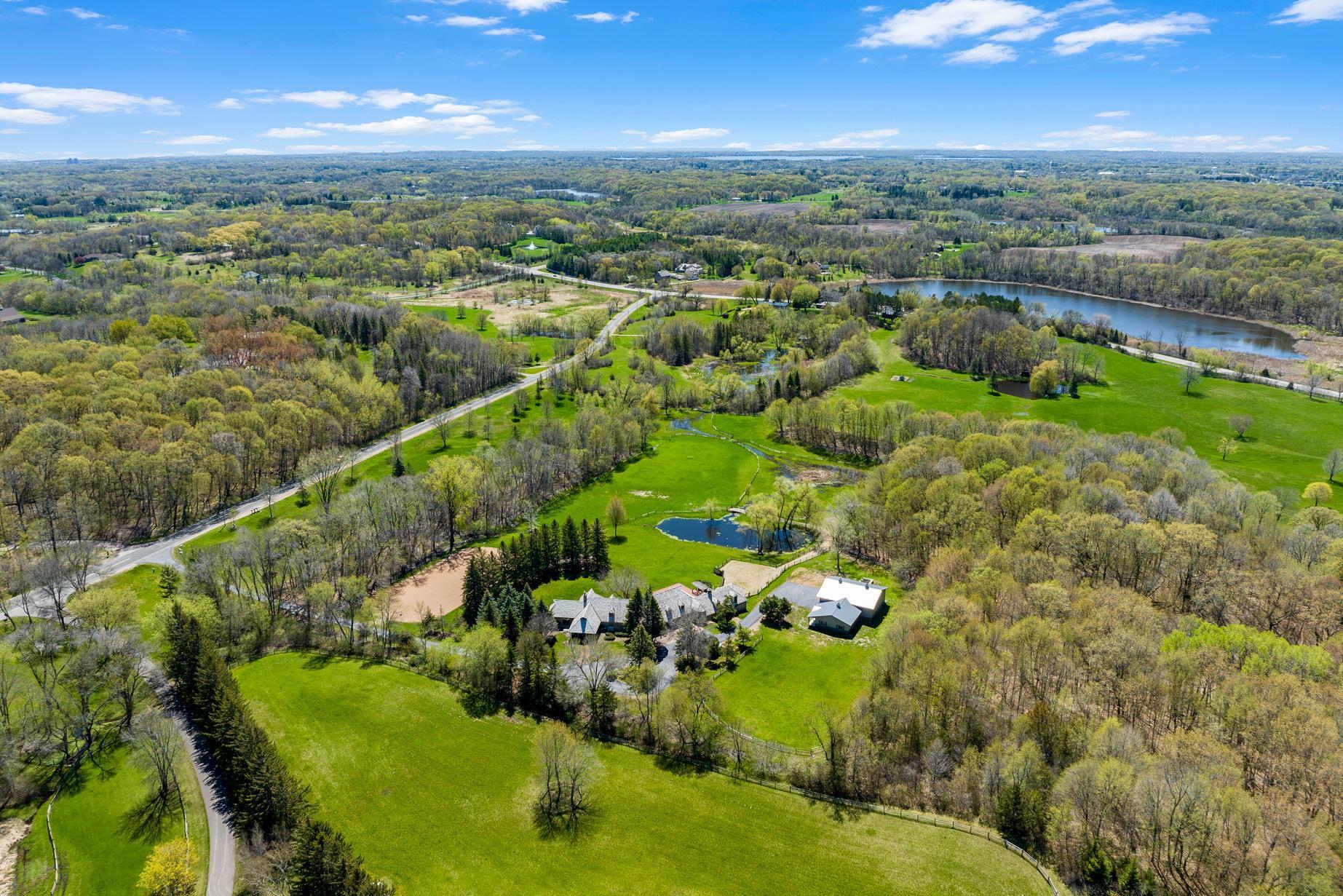 Move right in, renovate, or tear-down to build new at one of Medina's premier home sites in the countryside, just 12 minutes from 494. Designed by Humphrey & Hardenbergh, the estate was meticulously developed to maximize privacy, views, integration with nature, and use for outdoor activities. Built of durable, timeless, fine redwood lumber, the home was built to last and carefully positioned to place walls of windows along the southern elevation, bringing in natural light and breathtaking views of the vast estate and private pond. The home and grounds have been carefully maintained and updated throughout the chain of ownership. For equestrian enthusiasts, the property features riding trails, an outdoor arena, and a four-box stall barn with a feeding loft that is connected to the residence. Built in 2018, the 42' x 48' Morton Building features two additional finished spaces that can be used for workshop, exercise space, sport court, or flex, with in-floor heat and a half bath.