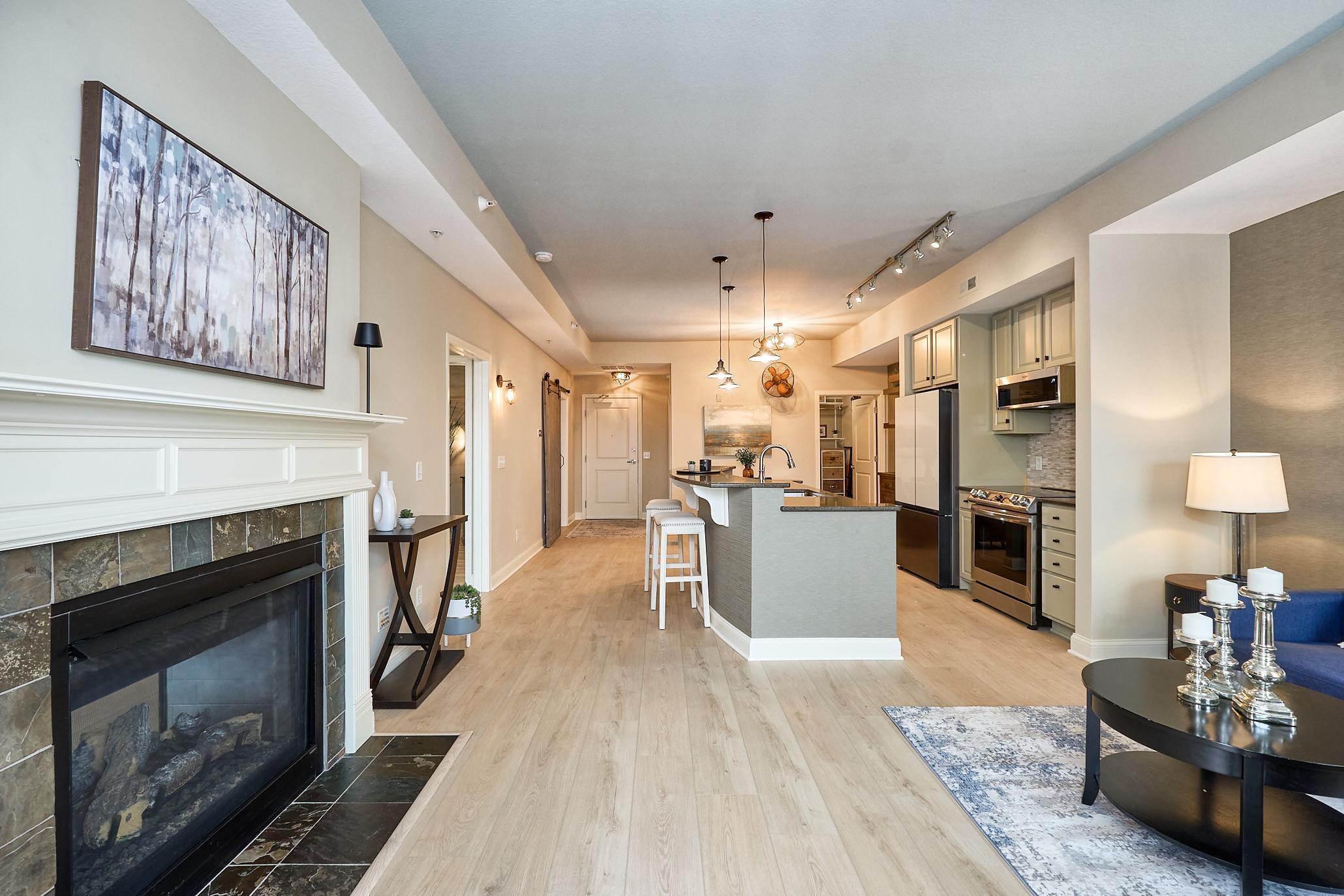 Luxurious One-Level Home with Stunning Lake Jonathan Views. Exceptional Lakefront Living. Experience breathtaking sunset views of Lake Jonathan from both the living room and the spacious primary bedroom. Every detail has been thoughtfully curated, featuring high-end finishes throughout for a refined living experience. Gourmet Chef’s Kitchen is a culinary dream, equipped with custom cabinetry, open shelving, and a generous granite island that offers ample workspace and seating. The state-of-the-art induction cooktop range includes convection, air fryer, dehydrator, and bake-and-broil oven functions, providing versatility for all your cooking needs. The refrigerator comes with a beverage center and interchangeable color panels, while the whisper-quiet dishwasher ensures a peaceful environment. Elegant tile accents in both the kitchen and bathroom complement the luxury vinyl plank flooring, contributing to the home’s modern aesthetic. Primary Suite with serene Lake and Trail Views, creating a tranquil retreat. A private walk-in closet offers ample storage, and a cozy two-sided gas fireplace, shared with the living room, enhances the ambiance—perfect for relaxing evenings at home. Seamless Indoor-Outdoor Living with a large, private 16×6 balcony accessible from both the living room and the primary bedroom via a second slider. This inviting space is an ideal spot to take in peaceful lake views and fresh air. Spa-Inspired Bathroom is truly exceptional, featuring a luxurious steam shower with a built-in seat, a double vanity for added convenience, and a separate water closet for privacy. An additional flexible room provides the ideal space for a home office, craft room, or a non-conforming bedroom, adapting to your unique needs. Convenient Laundry and Storage. The newer stacked washer and dryer maximize utility space in the in-unit laundry/utility room, leaving room for extra storage. A large private storage unit is conveniently located just down the hall. Resort-Style Building Amenities. Residents enjoy a wide array of amenities, including a heated outdoor pool and hot tub, a fitness room, a community room, fire pit, patios with gas grills, scenic trails, and even a complimentary car wash in the heated garage. Garage stall #39 is conveniently located near the elevator. A guest suite is available for friends and family visiting.