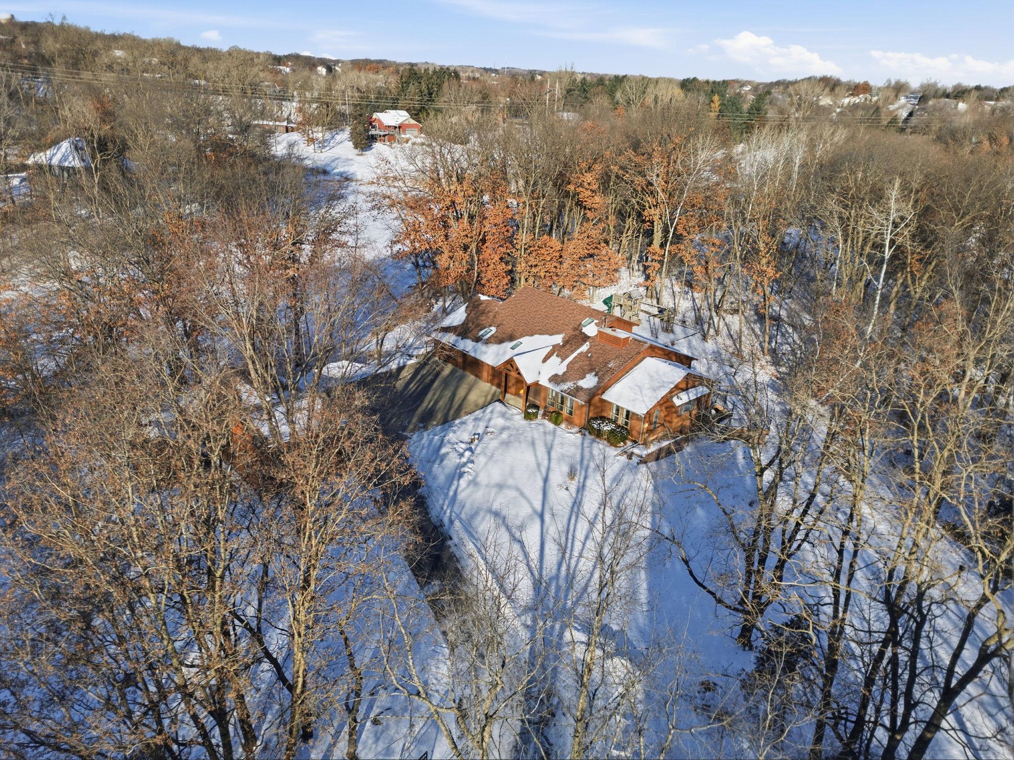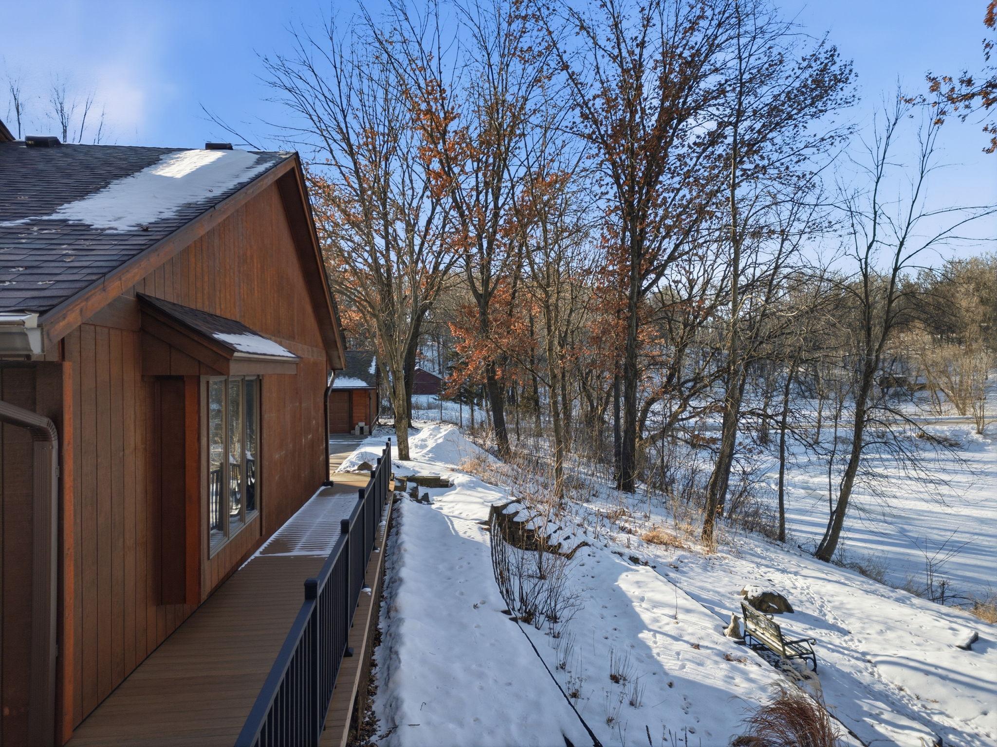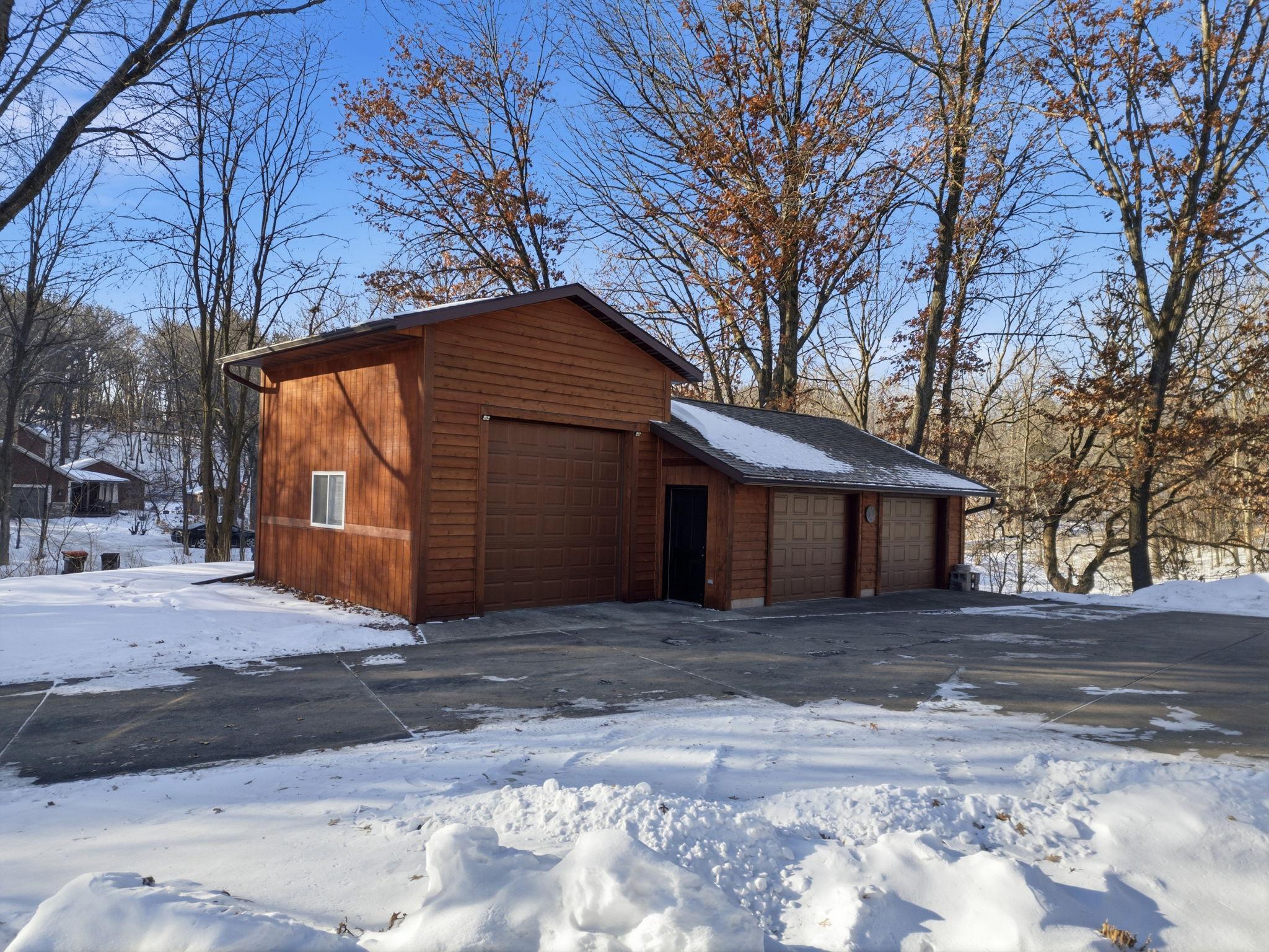 Do you like pond views and big garages? You've found the one! Tucked away on a dead end street surrounded by mature trees, this property offers privacy, space, and connection to nature. Surrounded by three picturesque ponds and space to breathe. Inside, the home is immaculate and thoughtfully designed. The main level features vaulted ceilings, skylights, and newer hardwood floors that create a bright, open feel. The remodeled kitchen includes ceiling-height cabinets, a large center island, and flows easily into the dining and living spaces. Enjoy your morning coffee in the 3-season porch overlooking the wooded setting and play area. You’ll love the flexibility of two primary suite options — main floor living or an expansive upper-level suite with two walk-in closets and a 5-piece bath featuring a large jetted tub. Main floor laundry, knockdown ceilings, Anderson windows and new maintenance-free decks add to the home’s convenience and comfort. Car enthusiasts and hobbyists will appreciate the garage setup: a 3-stall attached garage plus a 3-stall detached garage with one oversized insulated bay tall enough for a car lift! A large concrete driveway offers plenty of parking, and the new roof and extensive list of updates (see supplements) mean you can move right in and enjoy. Experience peaceful country living on 2.59 acres, just minutes from town, yet worlds away from it all.