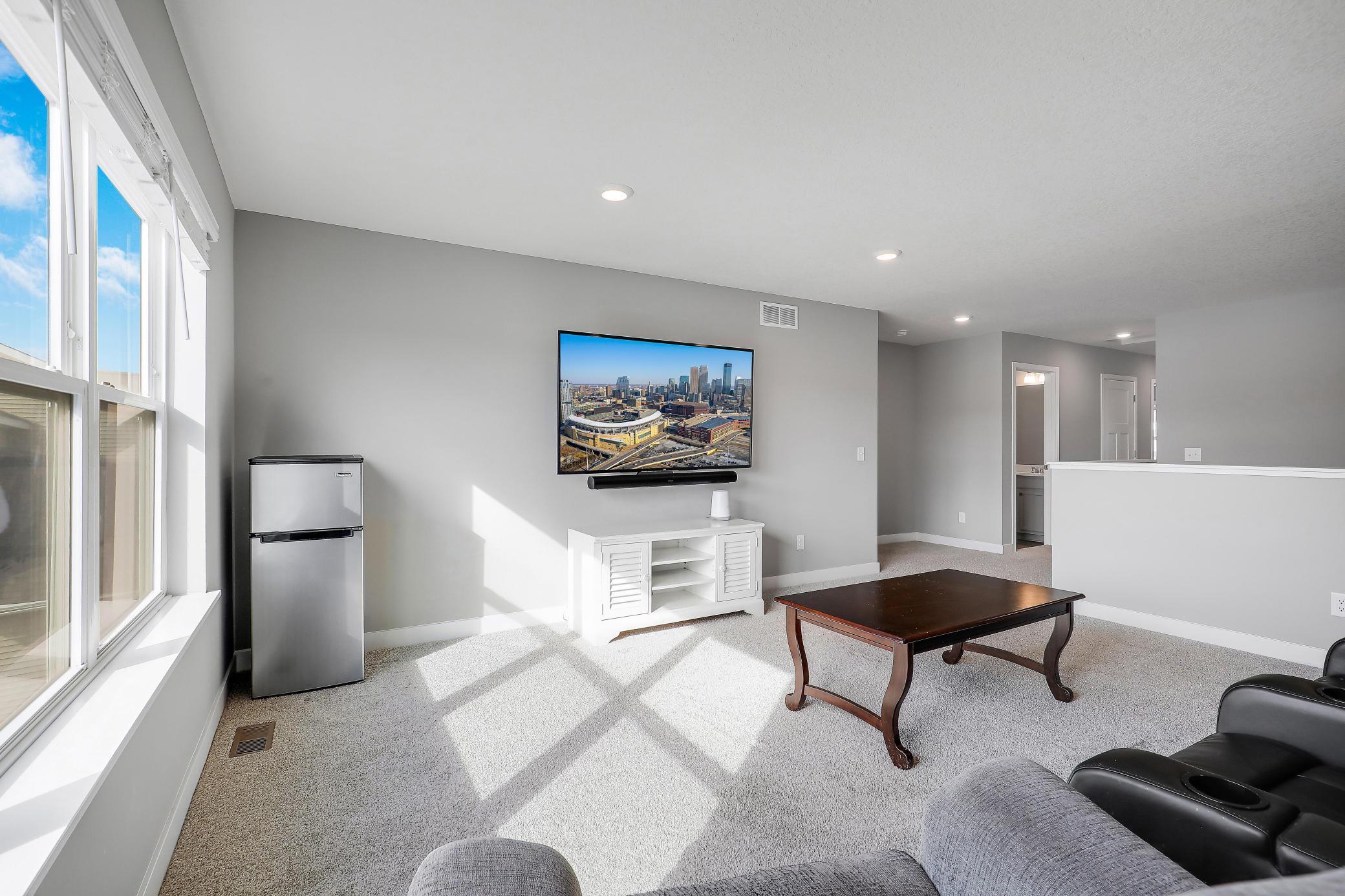 The upper level features three bedrooms, including one with an en suite bathroom, along with a large loft that provides flexible space for a second living area, home office, or playroom. The unfinished basement offers ample storage and the opportunity to add future living space.