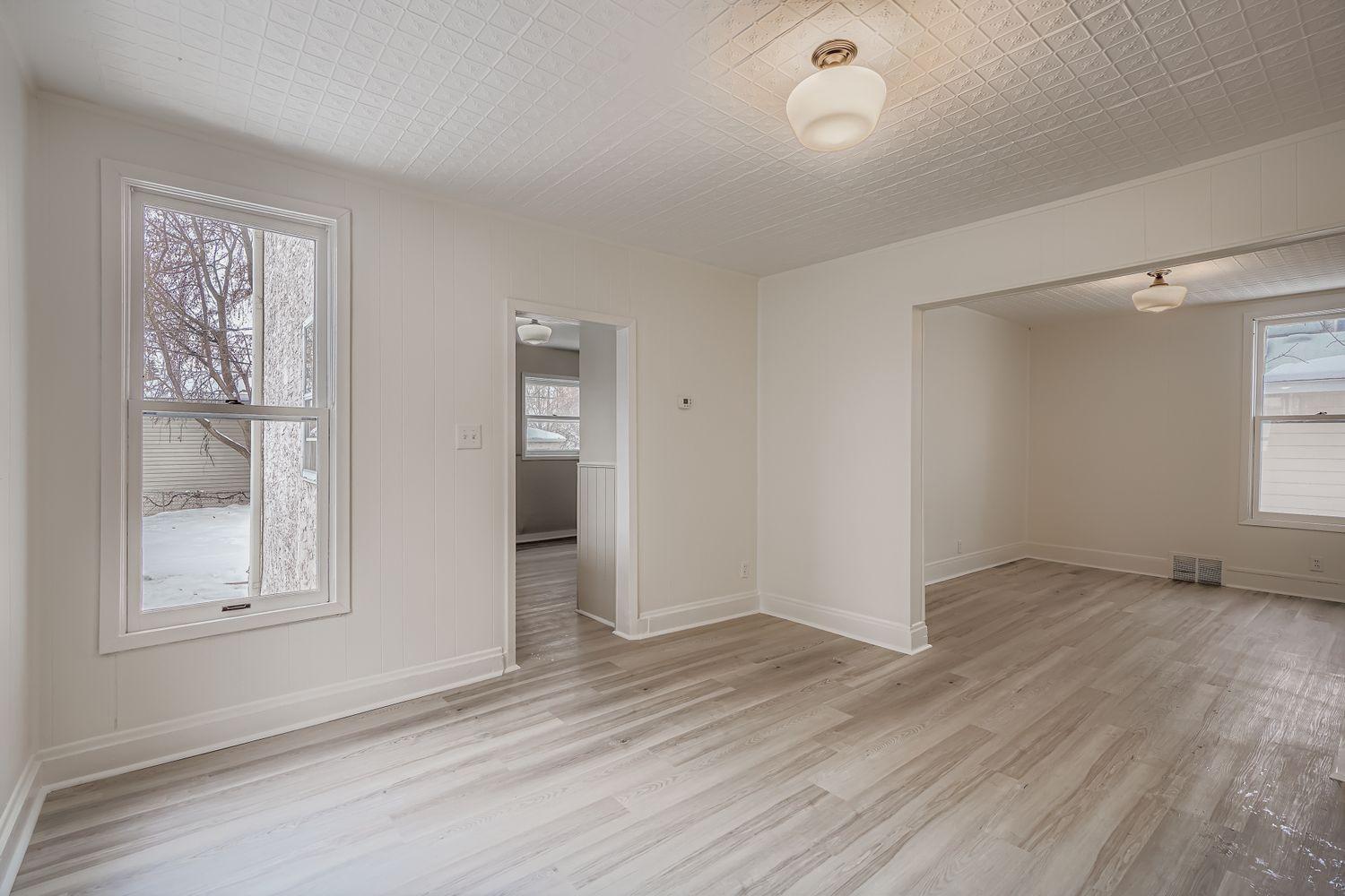 Step into this lovely turn-of-the-century home, rich with character and charm. Featuring a stunning stained-glass window and classic tin ceilings, this home blends historic details with fresh updates, including new paint and new flooring throughout. The main floor offers a convenient bedroom at the front of the home, while three additional bedrooms are located upstairs. Enjoy a spacious kitchen with main-floor laundry, perfect for everyday living. Recent upgrades include a brand-new asphalt driveway (2025). Outside, you’ll find a large yard and a two-car garage with extra storage. Ideally located just a few blocks from Prospect Park and the Mississippi River bluffs, with shopping and restaurants nearby, this home offers both charm and convenience. Tenant pays utilities and is responsible for lawn and snow.