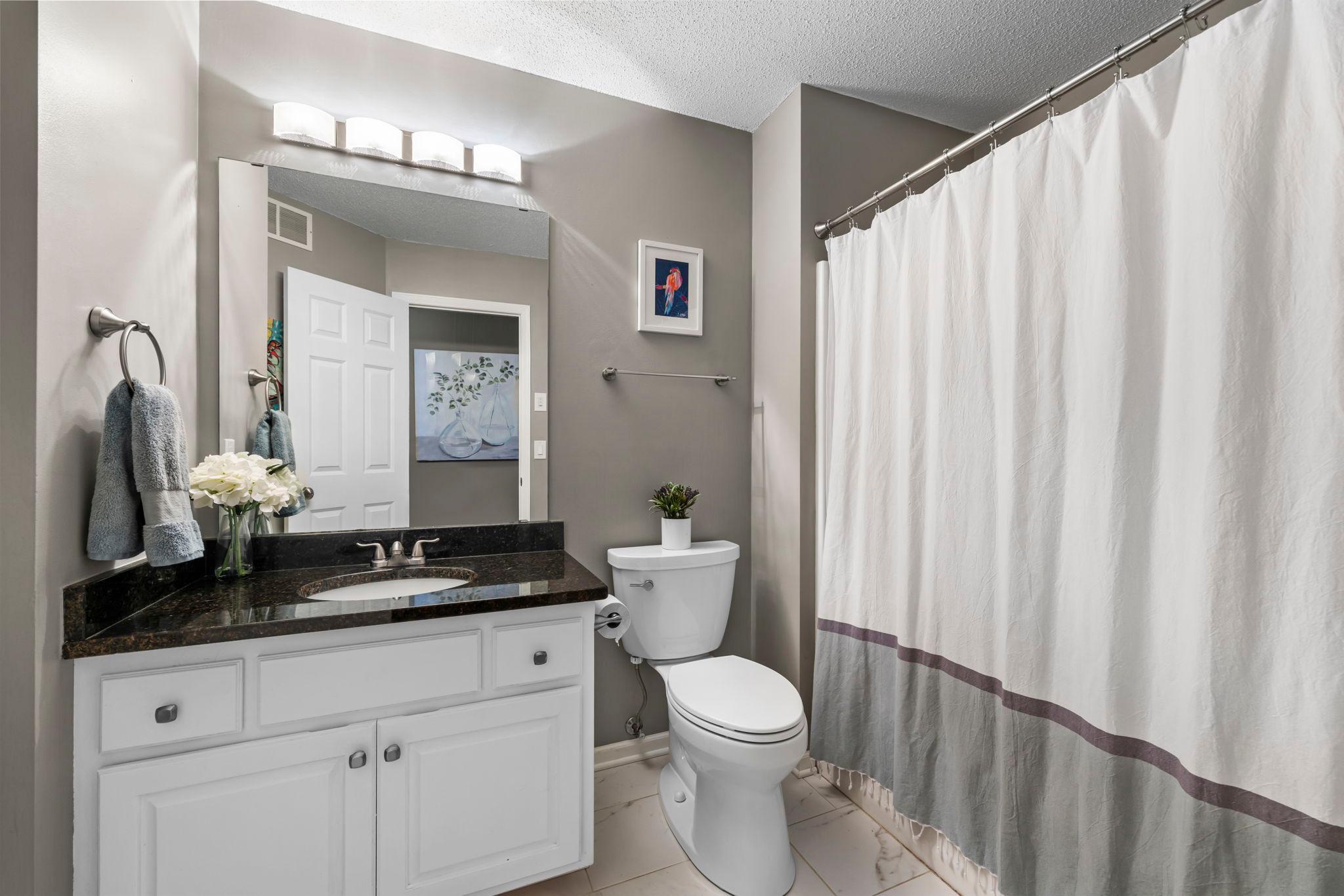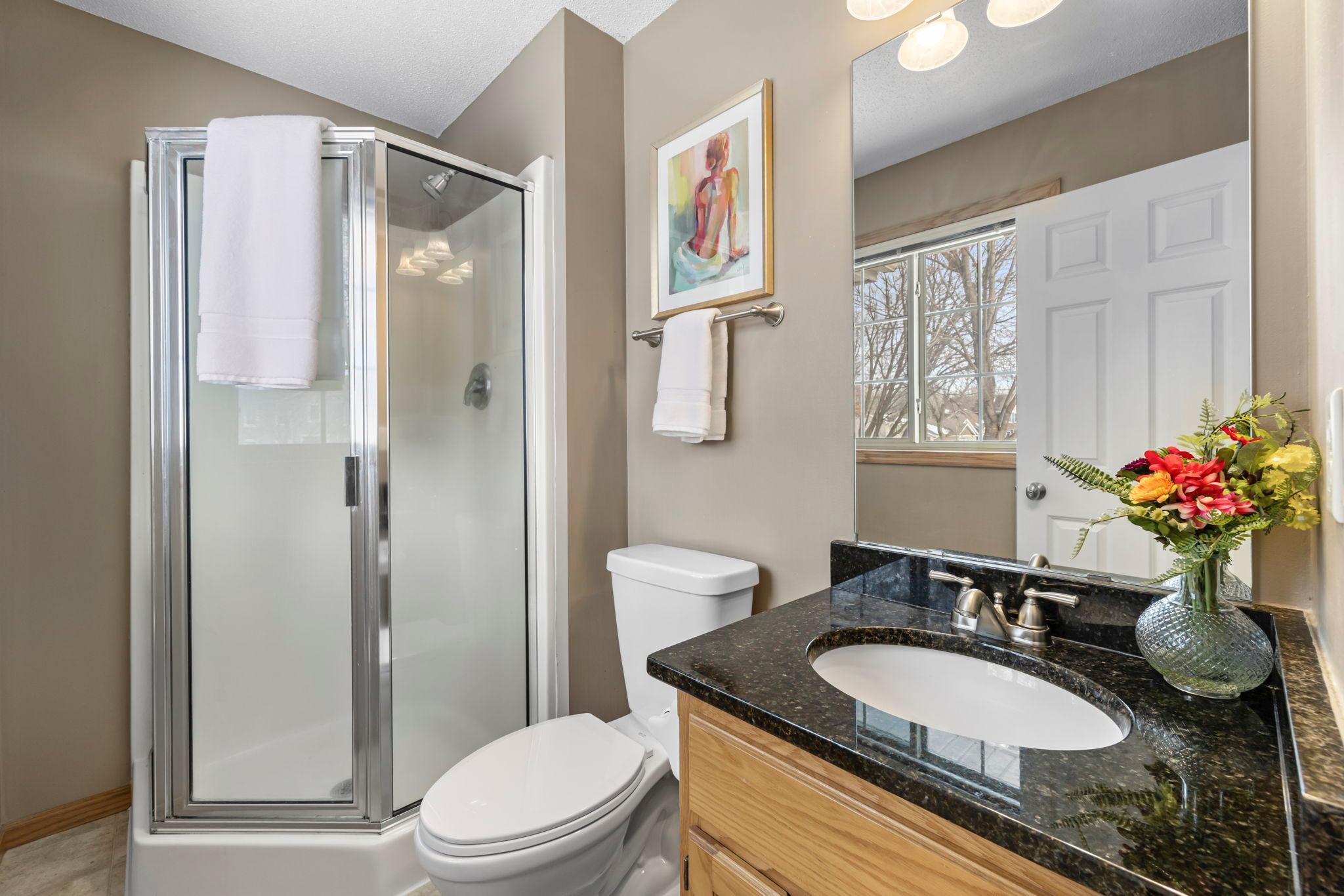 The upper level includes three bedrooms on one level, including a primary suite with a private 3/4 bath featuring a granite countertop. A full upper-level bath also offers a granite countertop for an updated feel.